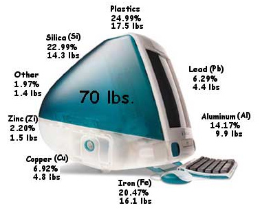 - جلوگیری از اتلاف منابع ارزشمند: این ضایعات علاوه بر مواد سمی حاوی مواد با ارزش نظیر طلا، پلاتین، پالادیم، نقره، مس،آلومینیوم، فولاد و انواع پلیمرهای قابل بازیافت بوده که در صورت بازیافت، فرصتهای اقتصادی مناسبی فراهم می کنند. میزان فلزات ارزشمند موجود در برخی از تجهیزات الکترونیکی در تصویر زیر مشاهده می شود.