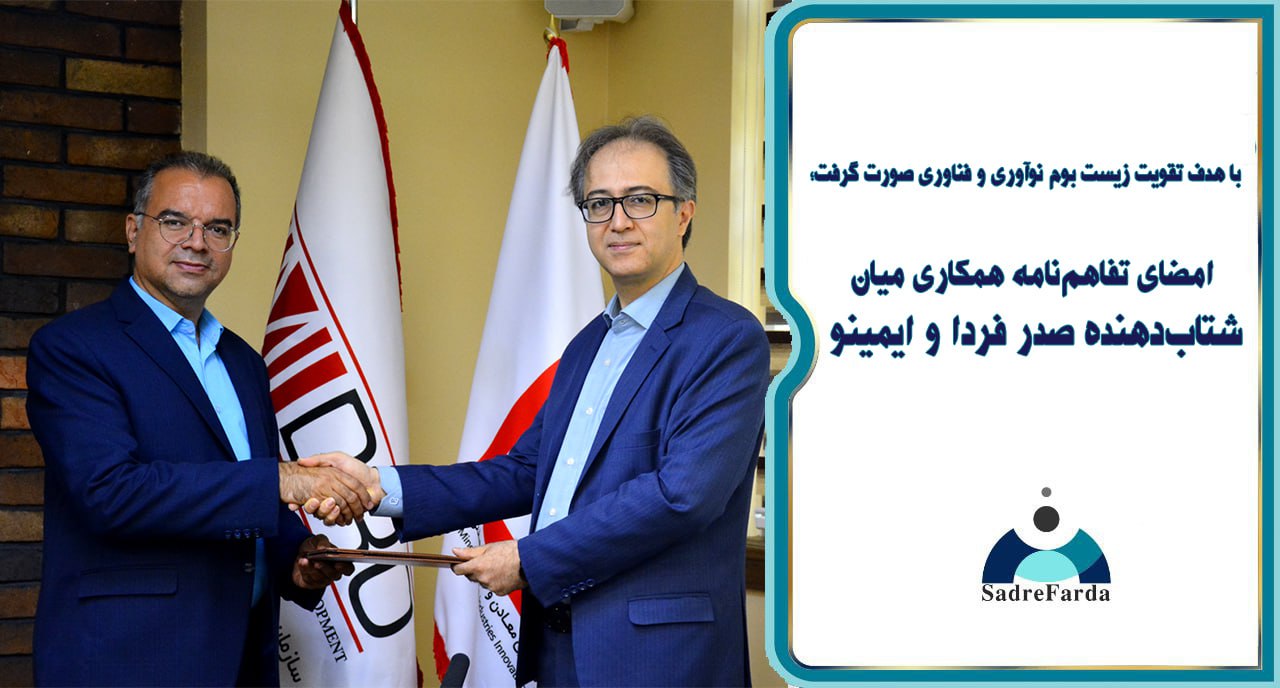 شتاب‌دهنده دانش بنیان صدر فردا و ایمینو، به منظور همکارى در راستاى توسعه زیست بوم نوآورى بخش معدن و صنایع معدنى و ایجاد ارتباط سازنده بین صنعت، کسب و کارهاى نوپا و شرکت‌های دانش‌بنیان این بخش، تفاهمنامه همکاری امضا کردند.