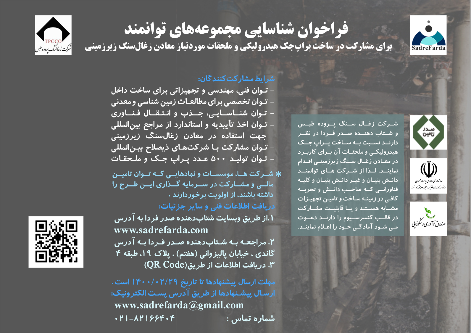 شرکت زغال سنگ پروده طبس و شتاب دهنده صدر فردا در نظر دارند نسبت به ساخت پراپ جک هیدرولیکی و ملحقات آن برای کاربرد در معادن زغال سنگ زیرزمینی اقدام نمایند. لذا از شرکت های توانمند دانش بنیان و غیر دانش بنیان و کلیه فناورانی که صاحب دانش و تجربه کافی در زمینه ساخت و تامین تجهیزات مشابه هستند و یا قابلیت مشارکت در قالب کنسرسیوم را دارند دعوت می شود آمادگی خود را اعلام نمایند.